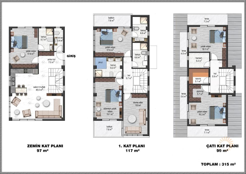 Auf der zweiten und obersten Etage der Villa finden Sie 2 weitere Doppelzimmer, von denen eines über ein eigenes Ankleidezimmer verfügt. Sowie eine private Sauna und ein türkisches Bad. Auf der obersten Etage der Villen befinden sich 4 Terrassen, wobei jedes Schlafzimmer auf 2 private Terrassen führt.