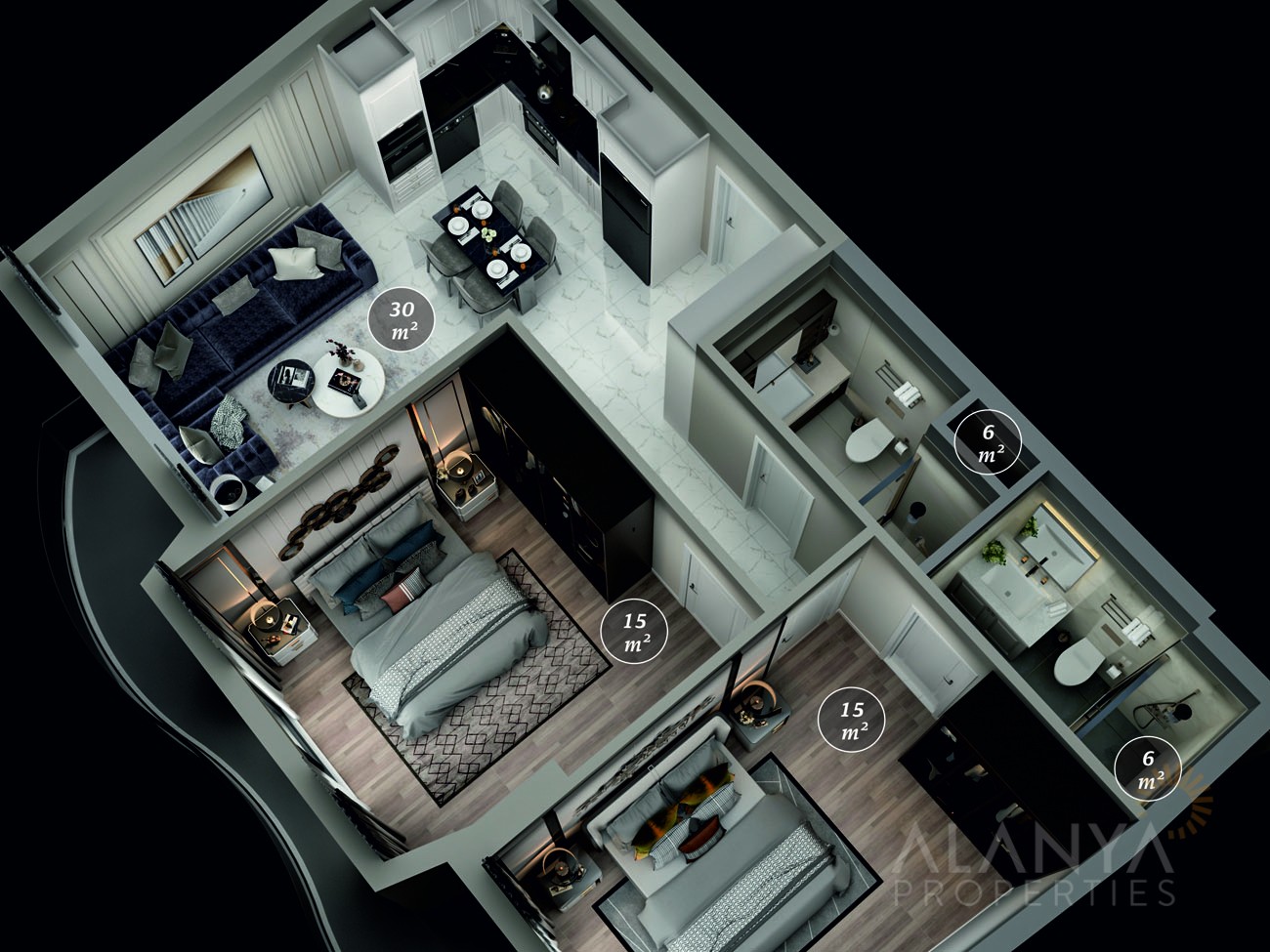 Contemporary new build apartments in Mahmutlar Alanya, 2,9 km from the beach and 2,5 km from the busy Mahmutlar centre. This modern project consists of 1 12 storey block with a total of 77 apartments. There are 4 different apartment types available. These include 1-bedroom apartments (50 – 51 m2) and 2-bedroom apartments (80 m2). As well as 2-bedroom and 3-bedroom penthouse apartments (98 – 147 m2)