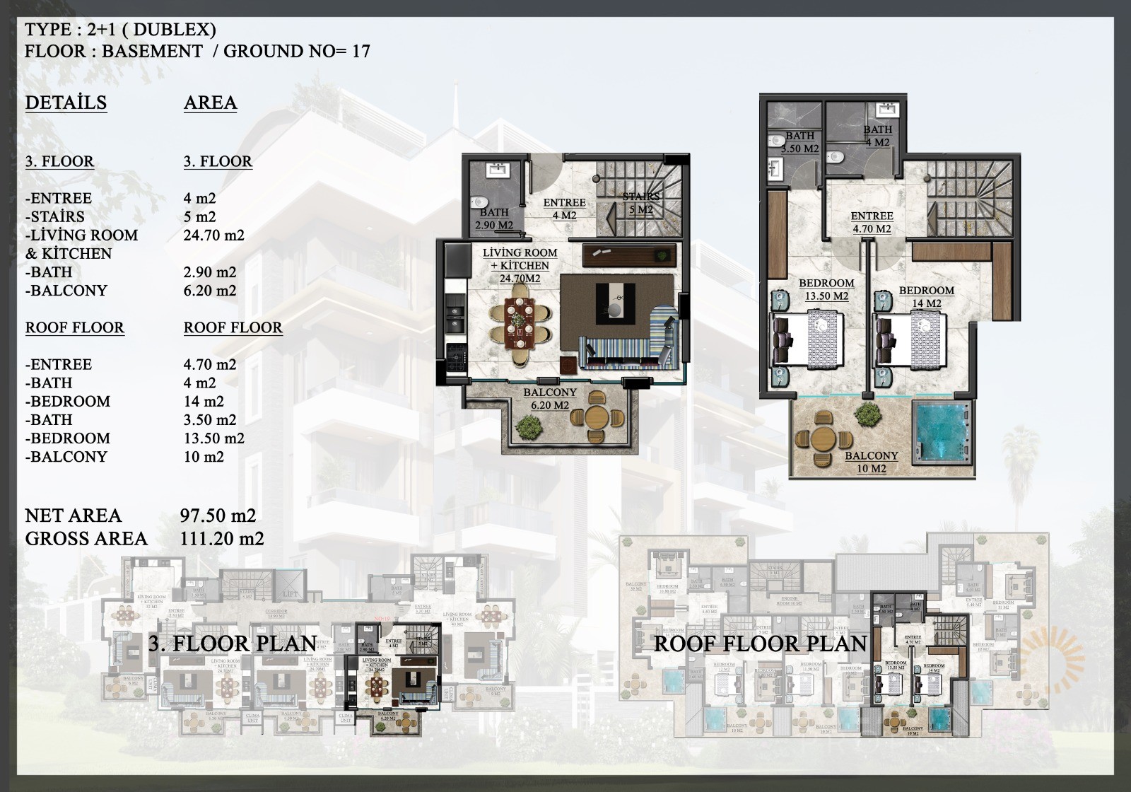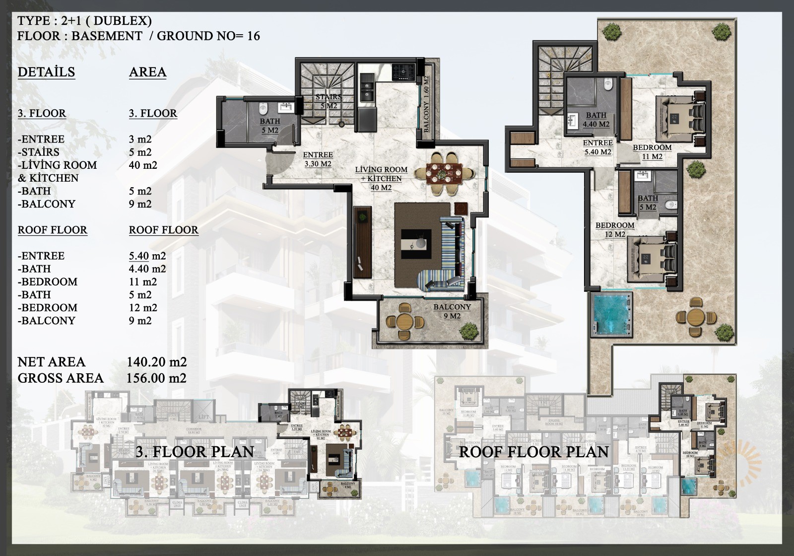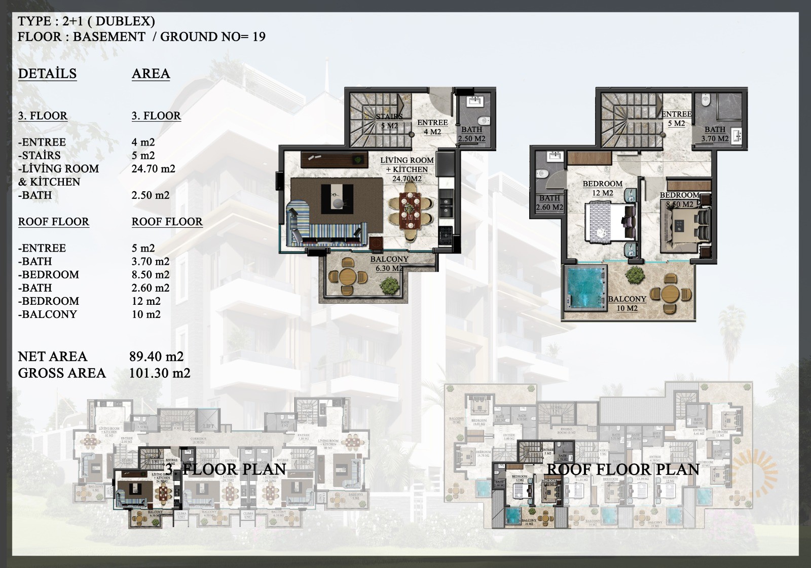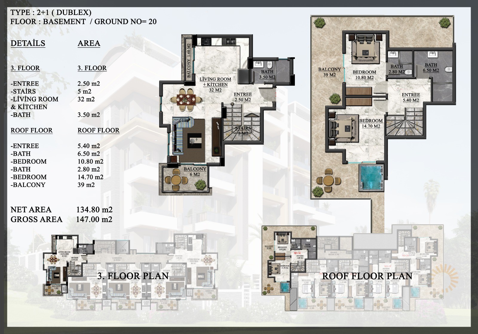 Investment opportunity in Oba Alanya with a contemporary project consisting of just 1 block. There are a total of just 20 apartments with 3 different apartment types available. These include 1-bedroom apartments (50,7 m2 to 52 m2), 2-bedroom penthouse apartments (101 m2 – 147 m2), as well as 2-bedroom garden duplex apartments with private swimming pools (125 m2 – 140 m2).